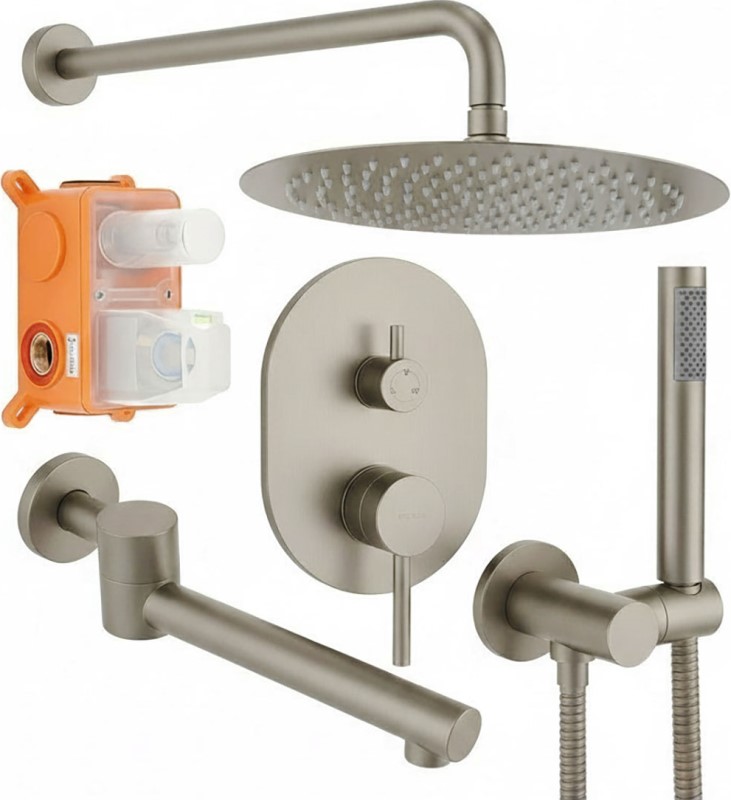 В комплекте: смеситель, встраиваемая часть, излив, верхний душ, кронштейн для верхнего душа, лейка, держатель для лейки, душевой шланг. |