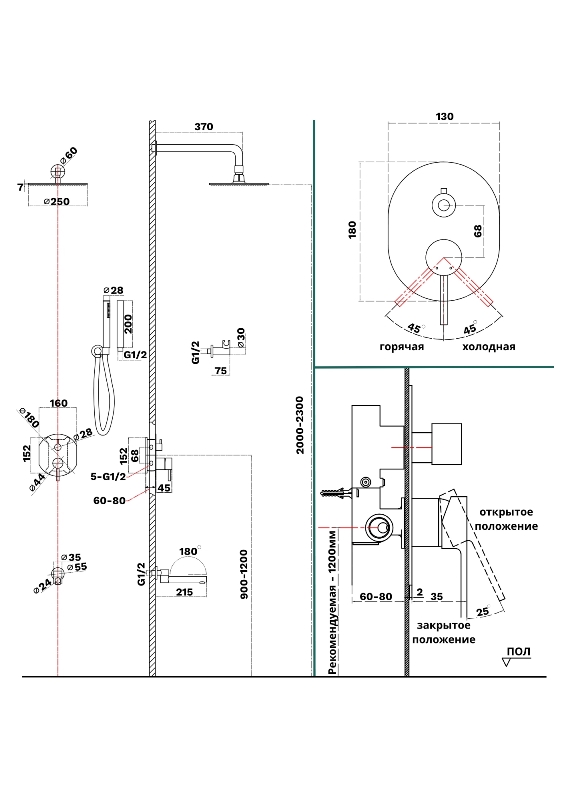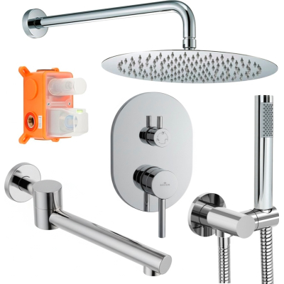 В комплекте: смеситель, встраиваемая часть, излив, верхний душ, кронштейн для верхнего душа, лейка, держатель для лейки, душевой шланг. |