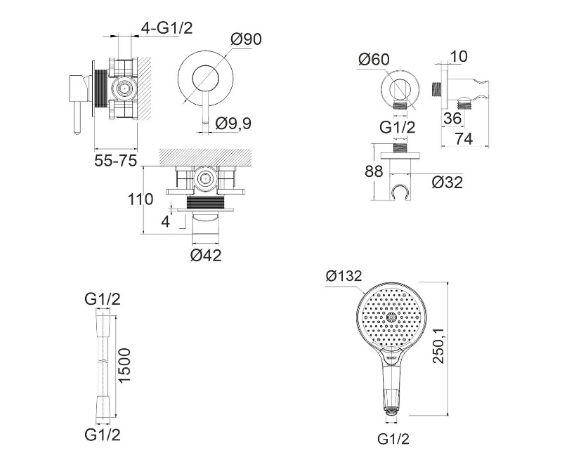 В комплекте: смеситель, встраиваемая часть, душевая лейка, держатель для лейки, душевой шланг. |