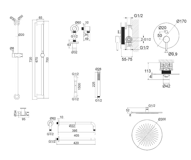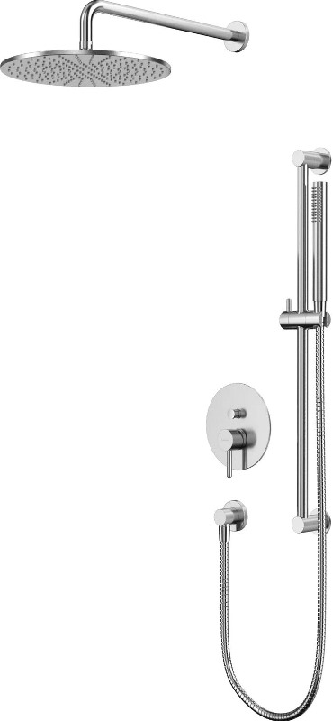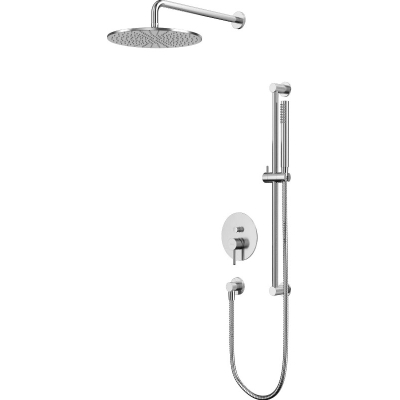 В комплекте: смеситель, встраиваемая часть, верхний душ, кронштейн для верхнего душа, штанга ручного душа, душевая лейка, держатель душевой лейки, душевой шланг. |
