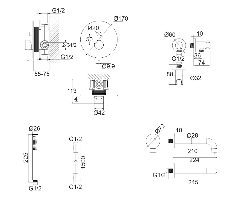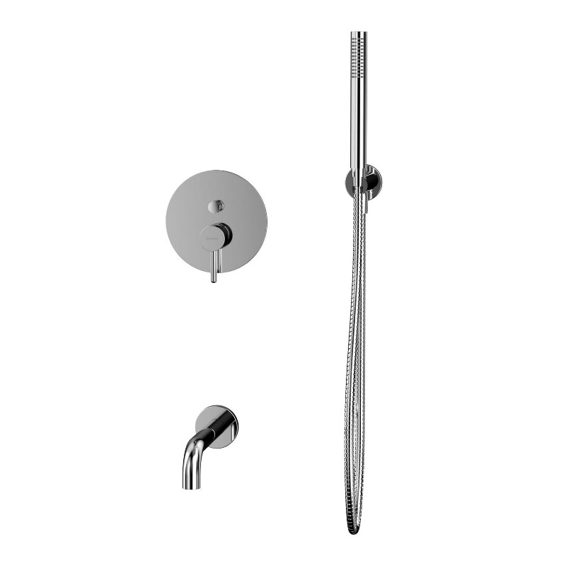 В комплекте: смеситель, встраиваемая часть, излив, держатель для лейки, душевой шланг. |