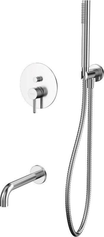 В комплекте: смеситель, встраиваемая часть, излив, держатель для лейки, душевой шланг. |