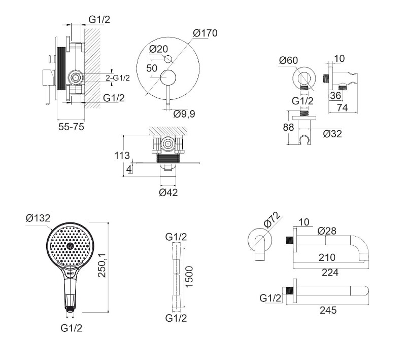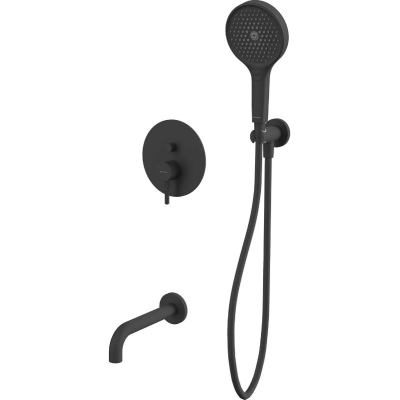 В комплекте: смеситель, встраиваемая часть, излив, душевая лейка, держатель для лейки, душевой шланг. |