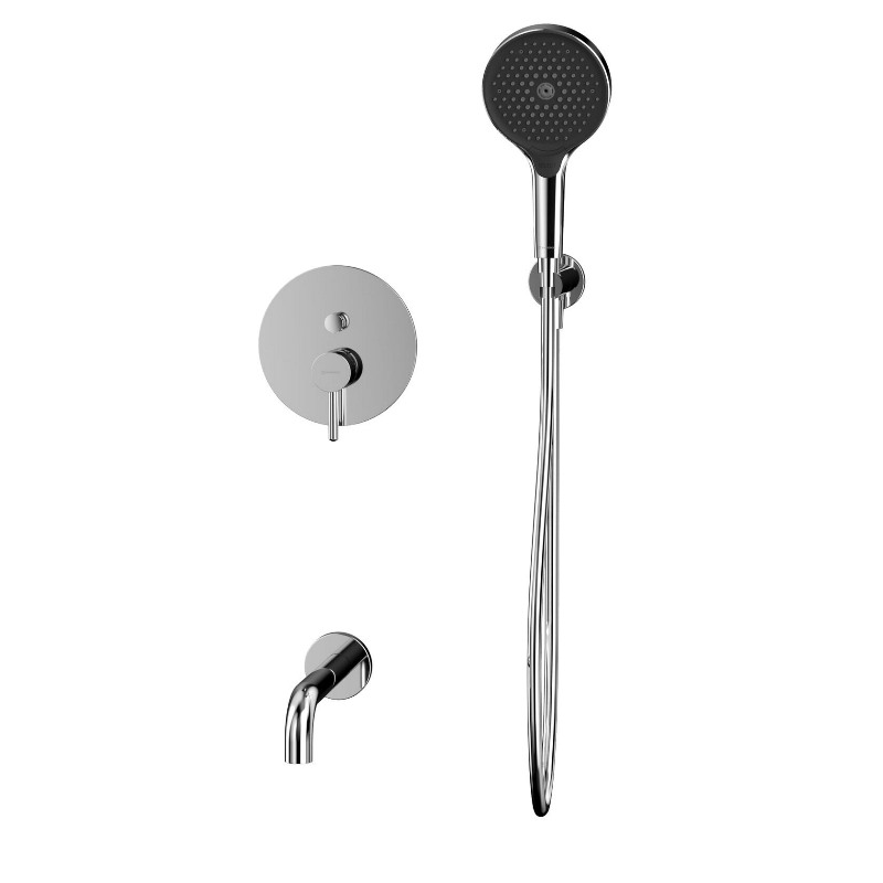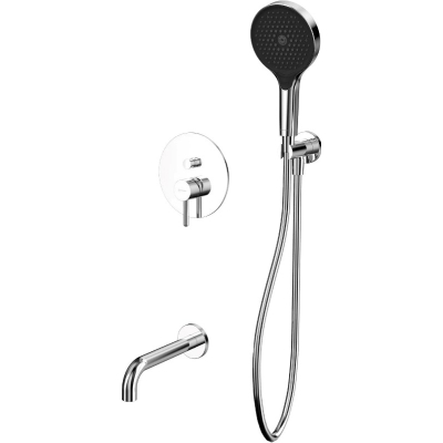 В комплекте: смеситель, встраиваемая часть, излив, душевая лейка, держатель для лейки, душевой шланг. |