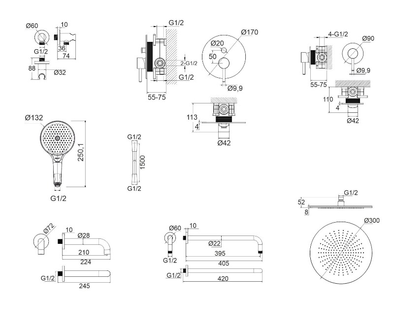 В комплекте: смесители, встраиваемая часть, излив, верхний душ, кронштейн для верхнего душа, лейка, держатель для лейки, душевой шланг. |