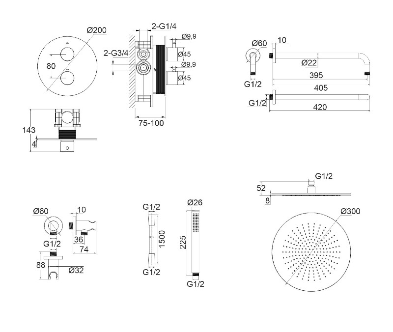 В комплекте: термостатический смеситель, встраиваемая часть, верхний душ, кронштейн для верхнего душа, душевая лейка, держатель для лейки, душевой шланг. |