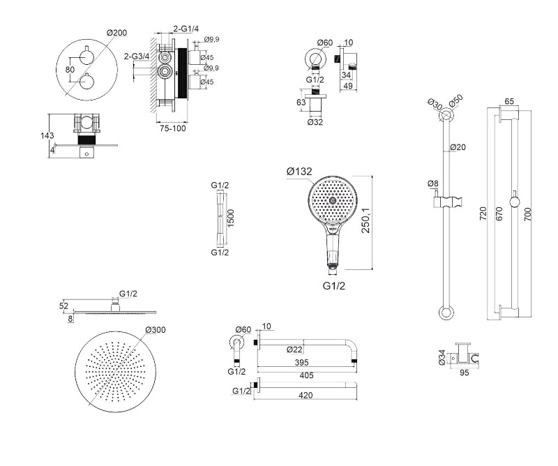 В комплекте: термостатический смеситель, встраиваемая часть, верхний душ, кронштейн для верхнего душа, штанга ручного душа, душевая лейка, держатель для лейки, душевой шланг. |