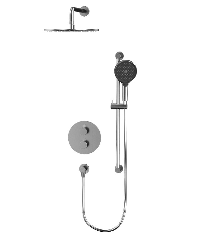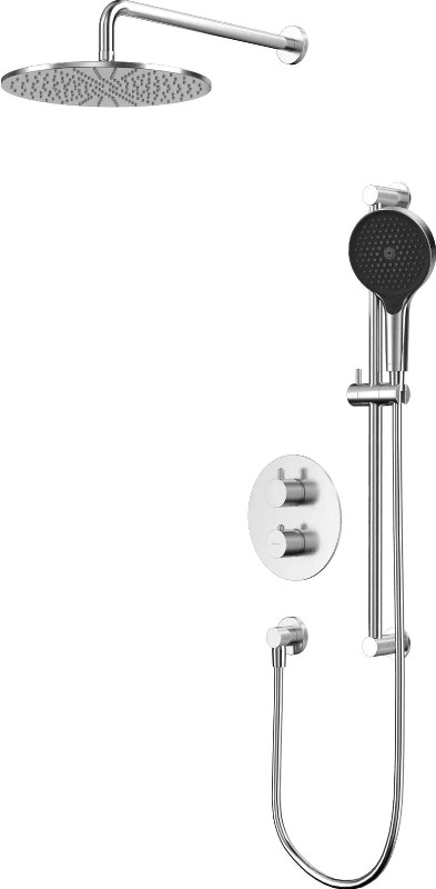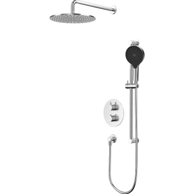 В комплекте: термостатический смеситель, встраиваемая часть, верхний душ, кронштейн для верхнего душа, штанга ручного душа, душевая лейка, держатель для лейки, душевой шланг. |