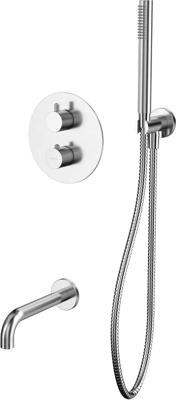 В комплекте: термостатический смеситель, встраиваемая часть, излив, душевая лейка, держатель для лейки, душевой шланг. |