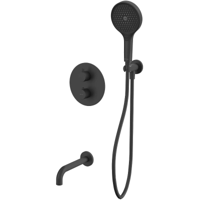 В комплекте: термостатический смеситель для ванны и душа, встраиваемая часть, излив, душевая лейка, держатель для лейки, душевой шланг. |