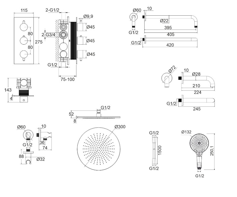 В комплекте: термостатический смеситель для ванны и душа, встраиваемая часть, излив, верхний душ, кронштейна верхнего душа, душевая лейка, держатель для лейки, душевой шланг. |