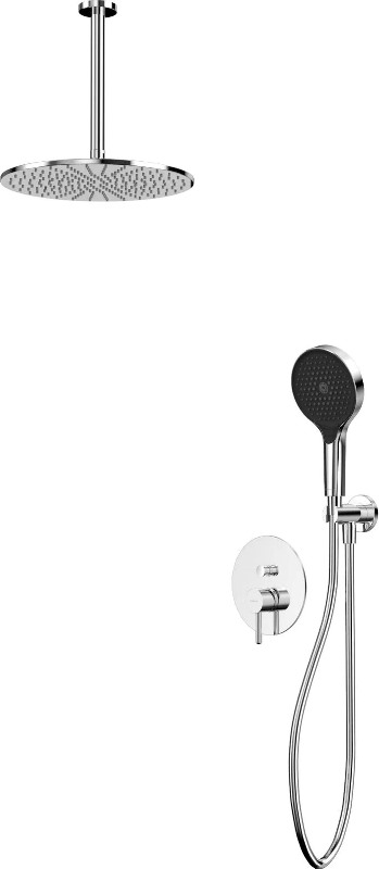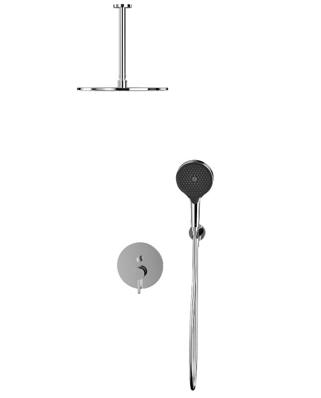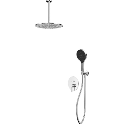 В комплекте: смеситель, встраиваемая часть, верхний душ, кронштейн для верхнего душа, душевая лейка, держатель для лейки, душевой шланг. |