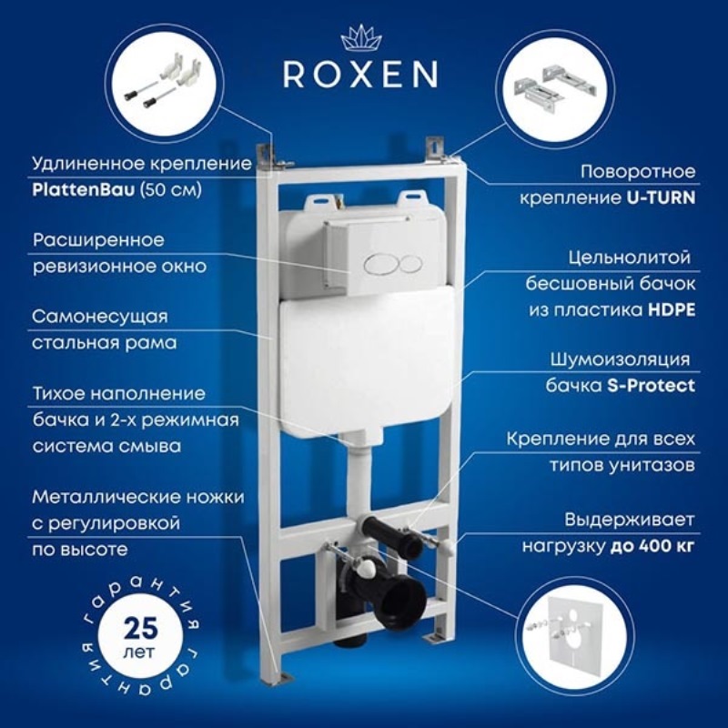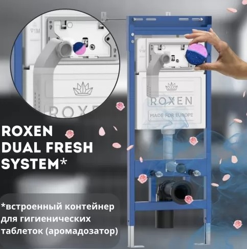 Инсталляция для унитаза Roxen StounFix Dual Fresh 868405 с кнопкой и с удлиненным креплением.Инсталляция. Усиленная ультратонкая модель. Оптимальная выверенная монтажная глубина 12 см. Глубина и высота инсталляции регулируются. Инсталляция монтируется в пол, на капитальную и на некапитальную стену. Выдерживает нагрузку до 400 кг. Цельнолитой бачок скрытого монтажа изготовлен из долговечного полимерного материала HDPE и защищен дополнительной шумоизоляционной пластиной S-Protect, которая предотвращает образование конденсата и плесени. Смыв настроен на использование инсталляции с безободковыми подвесными унитазами и предусматривает два режима 3/6 л. Латунный запорный вентиль. Доступ к коммуникациям осуществляется через увеличенное ревизионное отверстие кнопки инсталляции. Рама стальная с порошковым покрытием. Встроенный контейнер для гигиенических таблеток (аромадозатор). Система DualFresh - ароматизация и дезинфекция воды при помощи гигиенических таблеток. Кнопка. Velar 420300GM цвета оружейная сталь из нержавеющей стали с ручной обработкой металла. Антибактериальное покрытие Purity. Установка без использования инструментов. Бесшумная двухрежимная система смыва LightTouch. Быстросъемная система Easy Fix для быстрого доступа к коммуникациям. Монтаж. Инсталляция StounFix Dual Fresh 868405 совместима с любым подвесным унитазом. Межосевое расстояние между креплениями для унитаза 18-23 см. Производство. Компания Roxen основана в Финляндии. Благодаря современному оборудованию, инновационным технологиям и строгому скандинавскому подходу ее продукция заслуженно держится в топе продаж. Качество. Сантехника Roxen изготовлена только из проверенных, безопасных материалов. Каждое изделие проходит обязательную проверку на соответствие международным стандартам. Высокая надежность, безупречные линии и доступность делают изделия Роксен привлекательным выбором на любой вкус. Гарантия. Длительная гарантия - 25 лет. Изображение на мониторе может отличаться от оригинала. Комплектность: