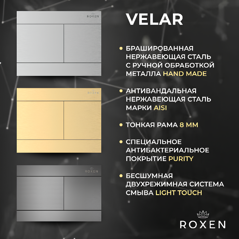 Инсталляция для унитаза Roxen StounFix Dual Fresh 868408 с кнопкой и с удлиненным креплением.Инсталляция. Усиленная ультратонкая модель. Оптимальная выверенная монтажная глубина 12 см. Глубина и высота инсталляции регулируются. Инсталляция монтируется в пол, на капитальную и на некапитальную стену. Выдерживает нагрузку до 400 кг. Цельнолитой бачок скрытого монтажа изготовлен из долговечного полимерного материала HDPE и защищен дополнительной шумоизоляционной пластиной S-Protect, которая предотвращает образование конденсата и плесени. Смыв настроен на использование инсталляции с безободковыми подвесными унитазами и предусматривает два режима 3/6 л. Латунный запорный вентиль. Доступ к коммуникациям осуществляется через увеличенное ревизионное отверстие кнопки инсталляции. Рама стальная с порошковым покрытием. Встроенный контейнер для гигиенических таблеток (аромадозатор). Система DualFresh - ароматизация и дезинфекция воды при помощи гигиенических таблеток. Кнопка. Velar 420300GB цвета брашированное золото из нержавеющей стали с ручной обработкой металла. Антибактериальное покрытие Purity. Установка без использования инструментов. Бесшумная двухрежимная система смыва LightTouch. Быстросъемная система Easy Fix для быстрого доступа к коммуникациям. Монтаж. Инсталляция StounFix Dual Fresh 968047 совместима с любым подвесным унитазом. Межосевое расстояние между креплениями для унитаза 18-23 см. Производство. Компания Roxen основана в Финляндии. Благодаря современному оборудованию, инновационным технологиям и строгому скандинавскому подходу ее продукция заслуженно держится в топе продаж. Качество. Сантехника Roxen изготовлена только из проверенных, безопасных материалов. Каждое изделие проходит обязательную проверку на соответствие международным стандартам. Высокая надежность, безупречные линии и доступность делают изделия Роксен привлекательным выбором на любой вкус. Гарантия. Длительная гарантия - 25 лет. Изображение на мониторе может отличаться от оригинала. Комплектность: