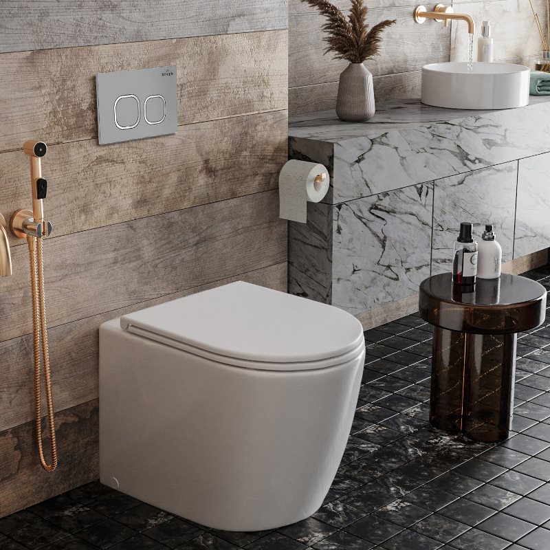 В комплекте: унитаз Antares 650185-01 приставной, бачок скрытого монтажа Attach 710215, тонкая крышка Duroplast с плавным опусканием, кнопка Santi 410280M пластик хром матовый, комплект креплений к стене. |