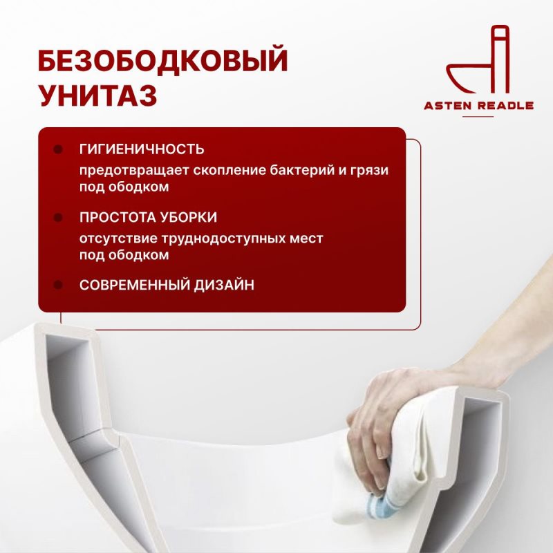 Комплект Asten Readle Zentralmodul AR0601-1065M - готовое решение.Унитаз. Подвесной унитаз Asten Readle Stella Tornado AR1065 из санитарного фарфора. Гладкая поверхность без пор препятствует перемещению бактерий. Антибактериальное покрытие обеспечивает легкий уход, белизну и первоначальный внешний вид на долгие годы. Чаша без внутреннего ободка Rimless. Эффективная технология смыва Tornado гарантирует превосходное омывание чаши по всей поверхности, экономный расход воды и низкий уровень шума при смыве. Сиденье. Тонкое легкосъемное сиденье с крышкой Soft Close из жесткого материала Duroplast повышенной прочности. Плавное, медленное, мягкое опускание микролифт не позволит крышке ударяться о борт унитаза. Хромированные металлические петли. Инсталляция. Усиленная монтажная рама выдерживает до 320 кг нагрузки. Оптимальная выверенная монтажная глубина 12-15 см. Глубина и высота инсталляции регулируются. Инсталляция монтируется на пол, на капитальную и на некапитальную стену. Специально разработанная система металлических креплений к стене дает возможность установки инсталляции в угол. Цельнолитой бачок скрытого монтажа изготовлен из долговечного полимерного материала HDPE и защищен шумоизоляционным пенополистиролом (EPS), который снижает уровень шума и предотвращает образование конденсата и плесени. Смыв настроен на использование инсталляции с подвесными унитазами и предусматривает два режима 3/6 л. Латунный запорный вентиль. Рама стальная с порошковым покрытием. Кнопка. Asten Readle AR0601-M цвета хром с матовой поверхностью из ударопрочного, экологически чистого ABS пластика марки HDPE. Легкоочищаемая устойчивая к истиранию поверхность. Установка без использования инструментов. Бесшумная двухрежимная система смыва. Быстросъемная система Easy Fix для быстрого доступа к коммуникациям. Производство. Молодая компания Asten Readle основана в Германии. Благодаря высокому качеству, стильному дизайну и доступной стоимостью товаров, ее продукция завоевала доверие покупателей. Качество. Сантехника Asten Readle изготовлена из проверенных и экологичных материалов. Каждое изделие проходит обязательную проверку на соответствие международным стандартам. Функциональность, удобство в использовании, современный дизайн делают изделия Asten Readle привлекательным выбором на любой вкус. Гарантия. Длительная гарантия - 20 лет. Изображение на мониторе может отличаться от оригинала. Комплектность: