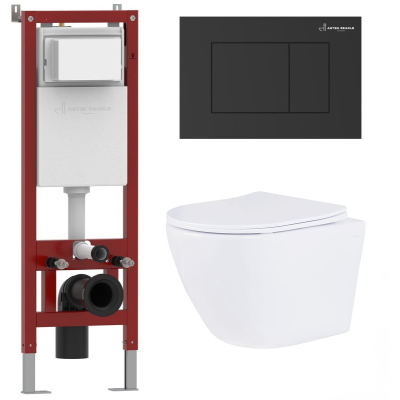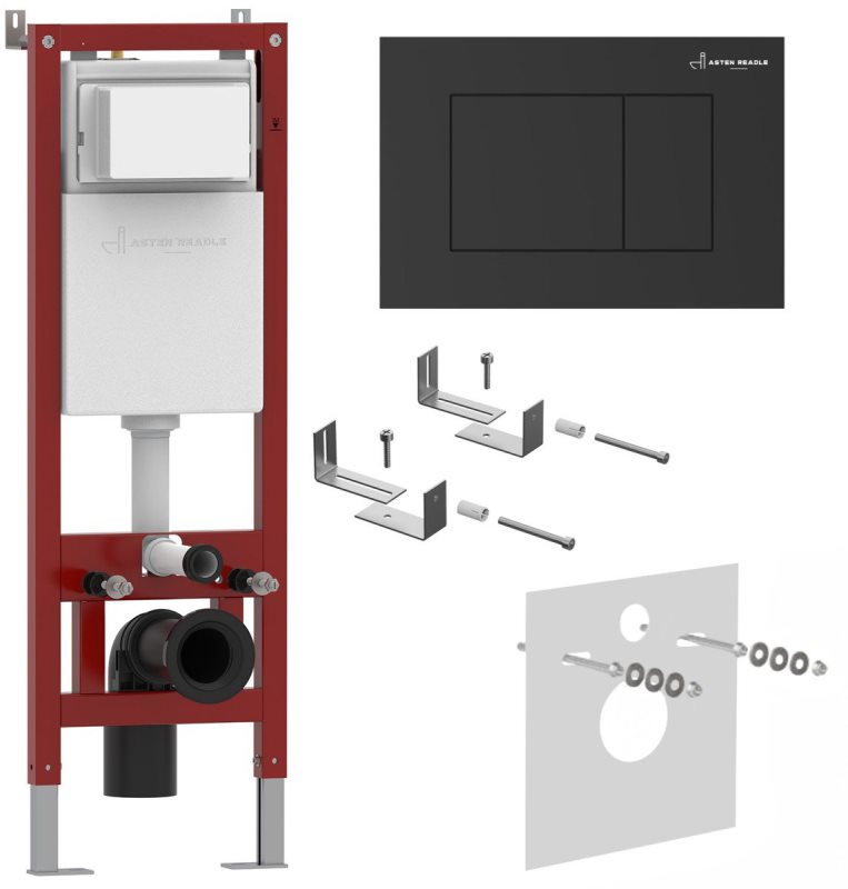 Комплект Asten Readle Zentralmodul AR0601-185B - готовое решение.Унитаз. Подвесной унитаз Roxen Antares 530185-01 из санитарного фарфора. Гладкая поверхность без пор препятствует перемещению бактерий. Антибактериальное покрытие обеспечивает легкий уход, белизну и первоначальный внешний вид на долгие годы. Чаша без внутреннего ободка Rimless c круговым смывом по всему периметру без разбрызгивания воды. Унитаз удаляет отходы с первого раза сильным каскадным потоком, при этом экономно расходует воду. Сиденье. Тонкое легкосъемное сиденье с крышкой Soft Close из жесткого материала Duroplast повышенной прочности. Плавное, медленное, мягкое опускание микролифт не позволит крышке ударяться о борт унитаза. Хромированные металлические петли. Инсталляция. Усиленная монтажная рама Asten Readle Zentralmodul AR0501 выдерживает до 320 кг нагрузки. Оптимальная выверенная монтажная глубина 12-15 см. Глубина и высота инсталляции регулируются. Инсталляция монтируется на пол, на капитальную и на некапитальную стену. Специально разработанная система металлических креплений к стене дает возможность установки инсталляции в угол. Цельнолитой бачок скрытого монтажа изготовлен из долговечного полимерного материала HDPE и защищен шумоизоляционным пенополистиролом (EPS), который снижает уровень шума и предотвращает образование конденсата и плесени. Смыв настроен на использование инсталляции с подвесными унитазами и предусматривает два режима 3/6 л. Латунный запорный вентиль. Рама стальная с порошковым покрытием. Кнопка. Asten Readle AR0601-B черного цвета с матовой поверхностью из ударопрочного, экологически чистого ABS пластика марки HDPE. Легкоочищаемая устойчивая к истиранию поверхность. Установка без использования инструментов. Бесшумная двухрежимная система смыва. Быстросъемная система Easy Fix для быстрого доступа к коммуникациям. Производство. Молодая компания Asten Readle основана в Германии. Благодаря высокому качеству, стильному дизайну и доступной стоимостью товаров, ее продукция завоевала доверие покупателей. Качество. Сантехника Asten Readle изготовлена из проверенных и экологичных материалов. Каждое изделие проходит обязательную проверку на соответствие международным стандартам. Функциональность, удобство в использовании, современный дизайн делают изделия Asten Readle привлекательным выбором на любой вкус. Гарантия. Длительная гарантия - 20 лет. Изображение на мониторе может отличаться от оригинала. Комплектность: