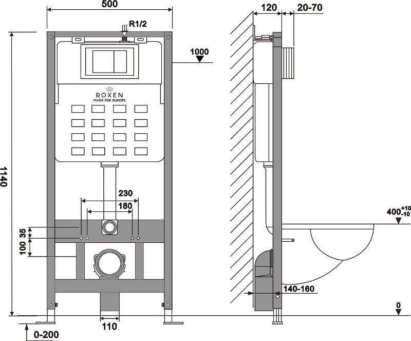 Унитаз с инсталляцией Roxen Antares подвесной с крышкой, с пр. кнопкой, оружейная сталь. Все характеристики |