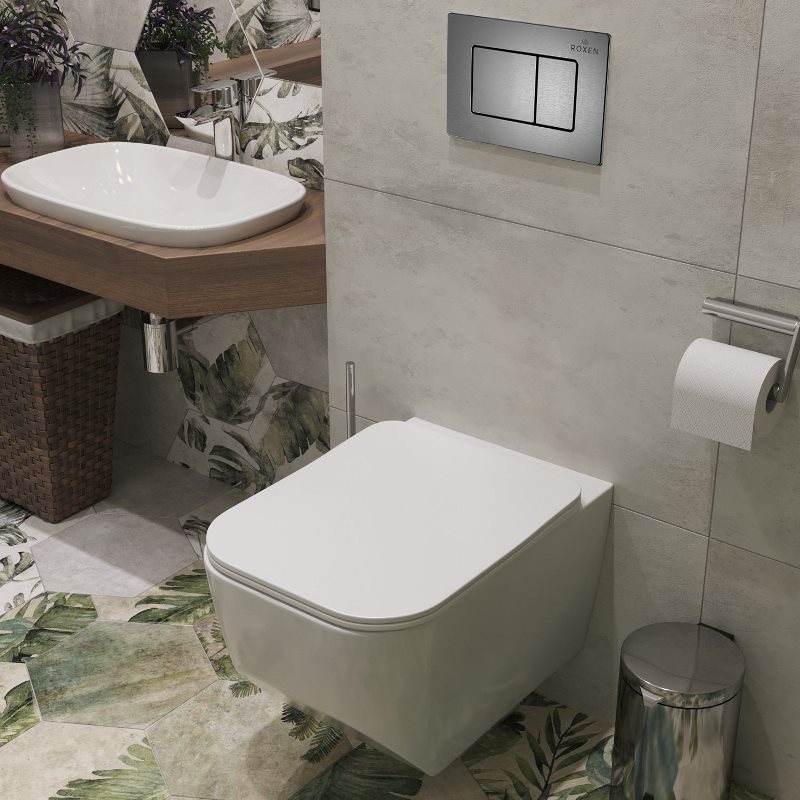 Комплект 6 в 1 Roxen StounFix Dual Fresh 621774 - готовое решение.Свойства материала. Подвесной унитаз Roxen Boro 530145-01 из санитарного фарфора PorCelain. Гладкая поверхность без пор препятствует перемещению бактерий. Антибактериальное покрытие Ultra Glide обеспечивает легкий уход, белизну и первоначальный внешний вид на долгие годы. Встроенный контейнер для гигиенических таблеток (аромадозатор). Безободковый. Чаша без внутреннего ободка Pro-Rimless c круговым смывом по всему периметру без разбрызгивания воды. Унитаз удаляет отходы с первого раза сильным каскадным потоком, при этом экономно расходует воду. Сиденье. Тонкое легкосъемное сиденье Quick Fix с крышкой Soft Close из жесткого материала Duroplast повышенной прочности. Плавное, медленное, мягкое опускание микролифт не позволит крышке ударяться о борт унитаза. Цвет крышки с сиденьем идеально подходит в тон унитаза, сохранит свой первоначальный блеск на долго. Хромированные металлические петли. Производство. Компания Roxen основана в Финляндии. Благодаря современному оборудованию, инновационным технологиям и строгому скандинавскому подходу ее продукция заслуженно держится в топе продаж. Качество. Сантехника Roxen изготовлена только из проверенных, безопасных материалов. Каждое изделие проходит обязательную проверку на соответствие международным стандартам. Высокая надежность, безупречные линии и доступность делают изделия Роксен привлекательным выбором на любой вкус. Гарантия. Длительная гарантия на фаянс - 25 лет. Изображение на мониторе может отличаться от оригинала. Комплектность: