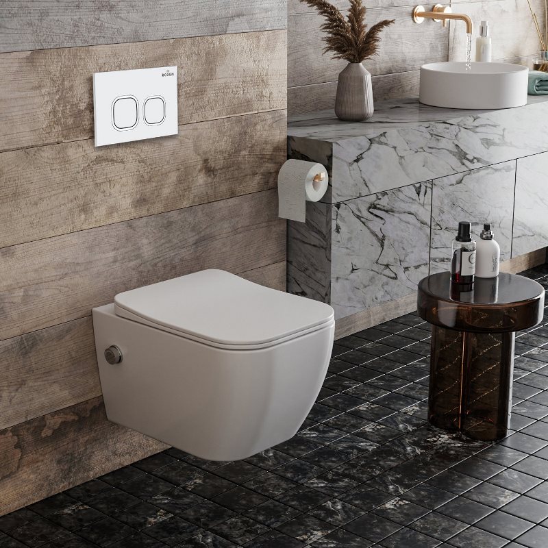 В комплекте: унитаз-биде Cube 530135-01X подвесной, инсталляция StounFix Dual Fresh 710200 с бачком скрытого монтажа, тонкая крышка Duroplast с плавным опусканием,кнопка Santi 410280W пластик белый глянцевый, удлиненный комплект креплений к стене, звукоизоляция. |
