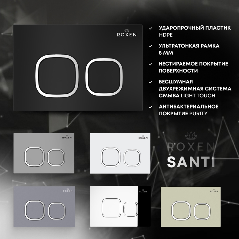 Комплект 6 в 1 Roxen StounFix Dual Fresh 566036 - готовое решение.Свойства материала. Подвесной унитаз Roxen Cube 530135-01 из санитарного фарфора PorCelain. Гладкая поверхность без пор препятствует перемещению бактерий. Антибактериальное покрытие Ultra Glide обеспечивает легкий уход, белизну и первоначальный внешний вид на долгие годы. Встроенный контейнер для гигиенических таблеток (аромадозатор). Безободковый. Чаша без внутреннего ободка Pro-Rimless c круговым смывом по всему периметру без разбрызгивания воды. Унитаз удаляет отходы с первого раза сильным каскадным потоком, при этом экономно расходует воду. Сиденье. Тонкое легкосъемное сиденье Quick Fix с крышкой Soft Close из жесткого материала Duroplast повышенной прочности. Плавное, медленное, мягкое опускание микролифт не позволит крышке ударяться о борт унитаза. Цвет крышки с сиденьем идеально подходит в тон унитаза, сохранит свой первоначальный блеск на долго. Хромированные металлические петли. Производство. Компания Roxen основана в Финляндии. Благодаря современному оборудованию, инновационным технологиям и строгому скандинавскому подходу ее продукция заслуженно держится в топе продаж. Качество. Сантехника Roxen изготовлена только из проверенных, безопасных материалов. Каждое изделие проходит обязательную проверку на соответствие международным стандартам. Высокая надежность, безупречные линии и доступность делают изделия Роксен привлекательным выбором на любой вкус. Гарантия. Длительная гарантия на фаянс - 25 лет. Изображение на мониторе может отличаться от оригинала. Комплектность: