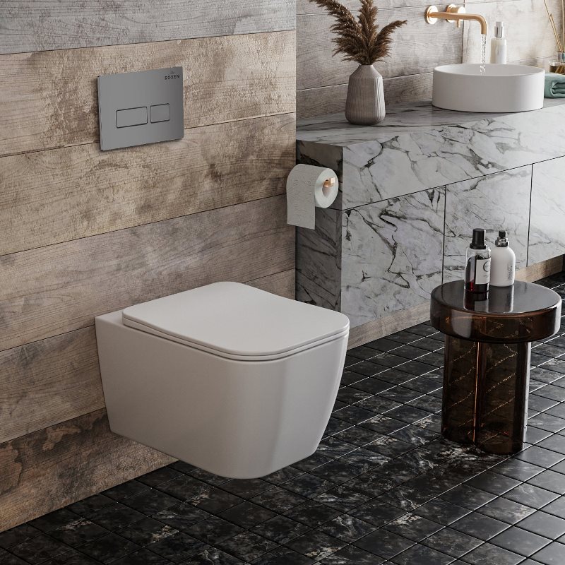 Унитаз с инсталляцией Roxen Cube Tornado подвесной с крышкой, с кнопкой пр., матов.хром. Все характеристики |