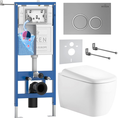 Комплект 6 в 1 Roxen StounFix Dual Fresh 968510 - готовое решение.Свойства материала. Подвесной унитаз Roxen Martin 530220-02 из санитарного фарфора PorCelain. Гладкая поверхность без пор препятствует перемещению бактерий. Антибактериальное покрытие Ultra Glide обеспечивает легкий уход, белизну и первоначальный внешний вид на долгие годы. Встроенный контейнер для гигиенических таблеток (аромадозатор). Безободковый. Чаша без внутреннего ободка Pro-Rimless c круговым смывом по всему периметру без разбрызгивания воды. Унитаз удаляет отходы с первого раза сильным каскадным потоком, при этом экономно расходует воду. Сиденье. Легкосъемное сиденье Quick Fix с крышкой Soft Close из жесткого материала Duroplast повышенной прочности. Плавное, медленное, мягкое опускание микролифт не позволит крышке ударяться о борт унитаза. Цвет крышки с сиденьем идеально подходит в тон унитаза, сохранит свой первоначальный блеск на долго. Хромированные металлические петли. Производство. Компания Roxen основана в Финляндии. Благодаря современному оборудованию, инновационным технологиям и строгому скандинавскому подходу ее продукция заслуженно держится в топе продаж. Качество. Сантехника Roxen изготовлена только из проверенных, безопасных материалов. Каждое изделие проходит обязательную проверку на соответствие международным стандартам. Высокая надежность, безупречные линии и доступность делают изделия Роксен привлекательным выбором на любой вкус. Гарантия. Длительная гарантия на фаянс - 25 лет. Изображение на мониторе может отличаться от оригинала. Комплектность: