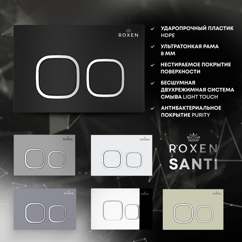 Комплект 6 в 1 Roxen StounFix Dual Fresh 968514 - готовое решение.Свойства материала. Подвесной унитаз Roxen Martin 530220-02 из санитарного фарфора PorCelain. Гладкая поверхность без пор препятствует перемещению бактерий. Антибактериальное покрытие Ultra Glide обеспечивает легкий уход, белизну и первоначальный внешний вид на долгие годы. Встроенный контейнер для гигиенических таблеток (аромадозатор). Безободковый. Чаша без внутреннего ободка Pro-Rimless c круговым смывом по всему периметру без разбрызгивания воды. Унитаз удаляет отходы с первого раза сильным каскадным потоком, при этом экономно расходует воду. Сиденье. Тонкое легкосъемное сиденье Quick Fix с крышкой Soft Close из жесткого материала Duroplast повышенной прочности. Плавное, медленное, мягкое опускание микролифт не позволит крышке ударяться о борт унитаза. Цвет крышки с сиденьем идеально подходит в тон унитаза, сохранит свой первоначальный блеск на долго. Хромированные металлические петли. Производство. Компания Roxen основана в Финляндии. Благодаря современному оборудованию, инновационным технологиям и строгому скандинавскому подходу ее продукция заслуженно держится в топе продаж. Качество. Сантехника Roxen изготовлена только из проверенных, безопасных материалов. Каждое изделие проходит обязательную проверку на соответствие международным стандартам. Высокая надежность, безупречные линии и доступность делают изделия Роксен привлекательным выбором на любой вкус. Гарантия. Длительная гарантия на фаянс - 25 лет. Изображение на мониторе может отличаться от оригинала. Комплектность:
