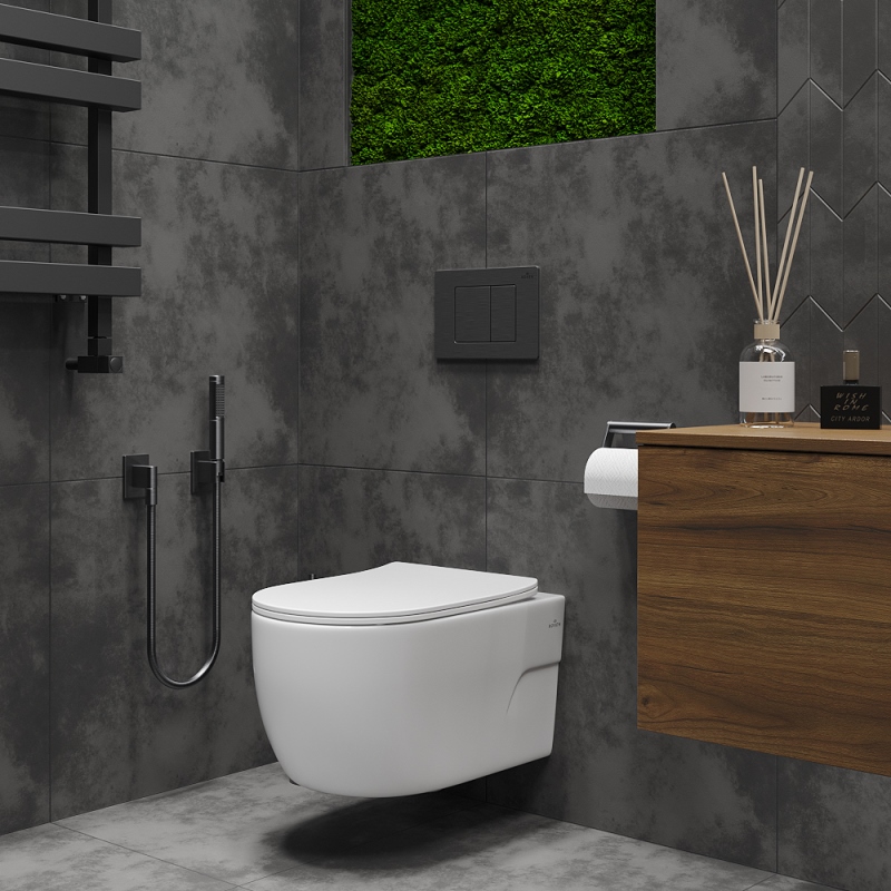 Унитаз с инсталляцией Roxen Porto подвесной с крышкой, с кнопкой пр.метал., черный. Все характеристики |