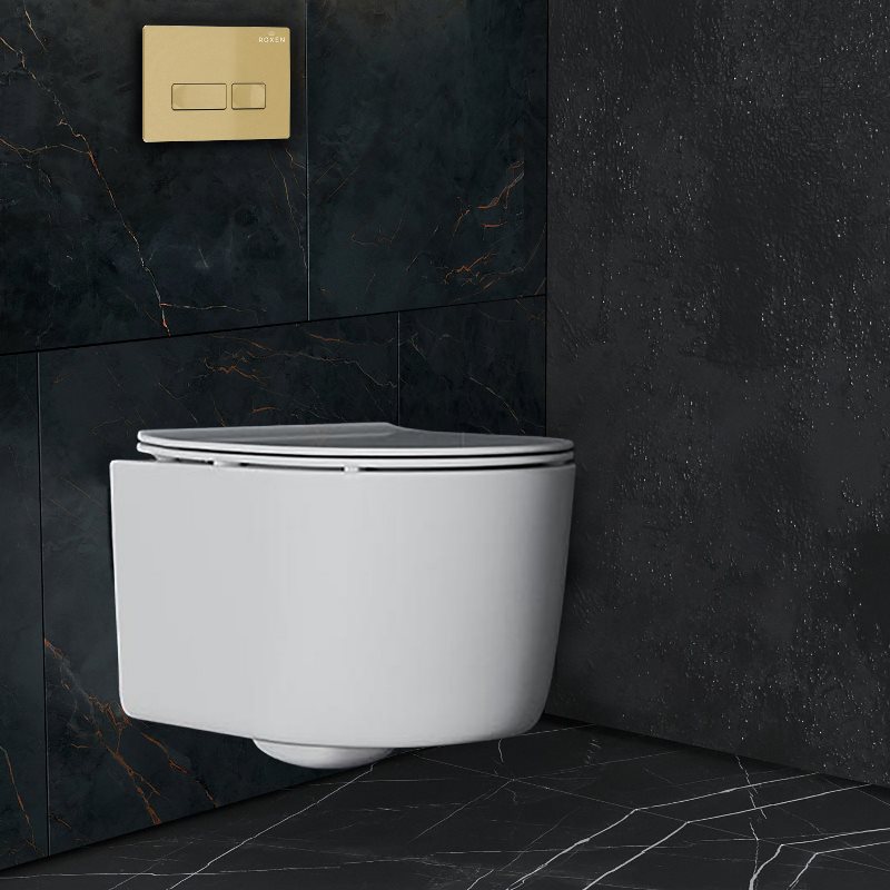 Унитаз с инсталляцией Roxen Simple Compact подвесной с крышкой, с кнопкой пр., брашированное золото. Все характеристики |