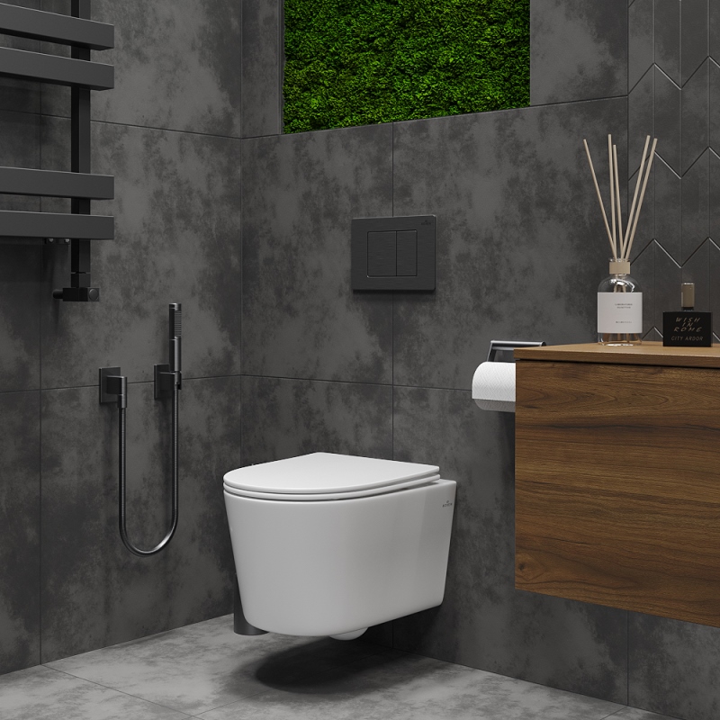 Унитаз с инсталляцией Roxen Simple Compact подвесной с крышкой, с кнопкой пр.металл, черный. Все характеристики |