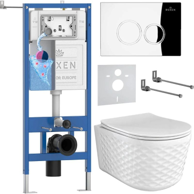 Комплект 6 в 1 Roxen StounFix Dual Fresh 979009 - готовое решение.Свойства материала. Подвесной унитаз Roxen Vine Tornado 530225-01 из санитарного фарфора PorCelain. Гладкая поверхность без пор препятствует перемещению бактерий. Антибактериальное покрытие Ultra Glide обеспечивает легкий уход, белизну и первоначальный внешний вид на долгие годы. Встроенный контейнер для гигиенических таблеток (аромадозатор). Безободковый. Чаша без внутреннего ободка Pro-Rimless cо смывом Tornado по всему периметру без разбрызгивания воды. Унитаз удаляет отходы с первого раза сильным круговым потоком, при этом экономно расходует воду. Сиденье. Легкосъемное сиденье Quick Fix с крышкой Soft Close из жесткого материала Duroplast повышенной прочности. Плавное, медленное, мягкое опускание микролифт не позволит крышке ударяться о борт унитаза. Цвет крышки с сиденьем идеально подходит в тон унитаза, сохранит свой первоначальный блеск на долго. Хромированные металлические петли. Производство. Компания Roxen основана в Финляндии. Благодаря современному оборудованию, инновационным технологиям и строгому скандинавскому подходу ее продукция заслуженно держится в топе продаж. Качество. Сантехника Roxen изготовлена только из проверенных, безопасных материалов. Каждое изделие проходит обязательную проверку на соответствие международным стандартам. Высокая надежность, безупречные линии и доступность делают изделия Роксен привлекательным выбором на любой вкус. Гарантия. Длительная гарантия на фаянс - 25 лет. Изображение на мониторе может отличаться от оригинала. Комплектность: