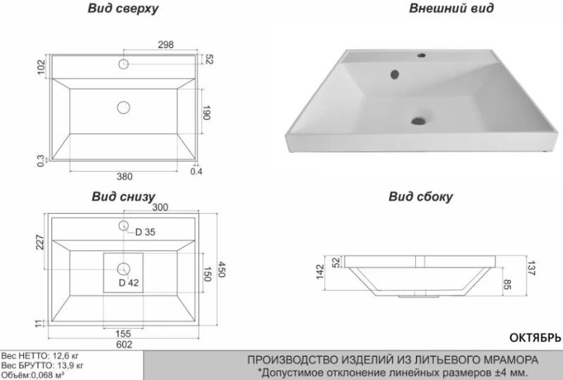 Только для продажи вместе с тумбой!Дополнительно комплектуется: смеситель, сифон, мебель. |