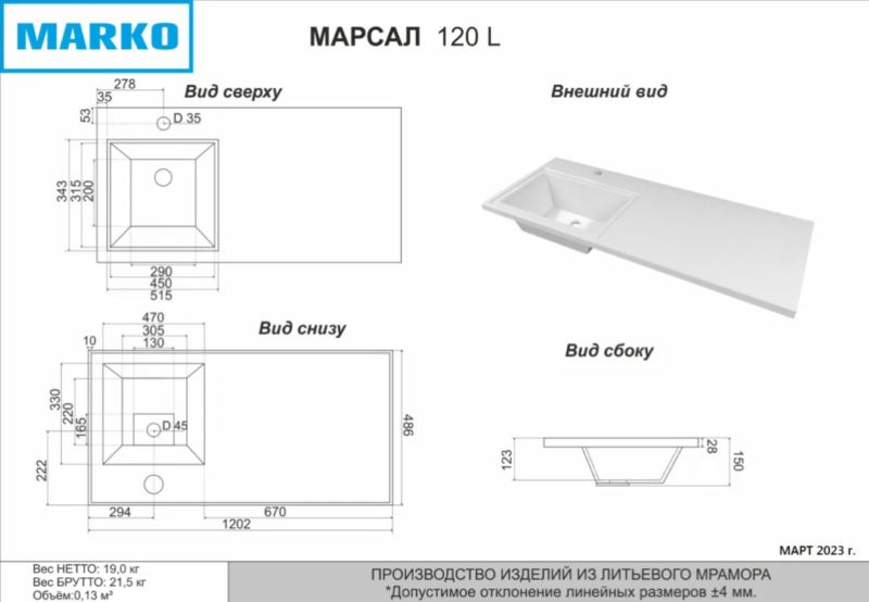 Умывальник Marko Марсал 120 на стиральную машину 5216120-2 из литьевого мрамора.Свойства материала. Натуральный молотый мрамор и полиэфирная смола. Гелькоутное покрытие ViaPal, плотная структура которого исключает образование грибка и плесени. Прочность значительно выше природного камня или бетона. Поверхность устойчива к химическим и умеренным механическим воздействиям. Белоснежный цвет, который не желтеет со временем. Точная геометрия. Установка. Раковина Марсал 120 см 5216120-2 для монтажа только на кронштейны над стиральной машиной. Установка непосредственно на поверхность бытового прибора не допустима. Удобное решение для небольших санузлов. Высота чаши-14.5 см. Разворот определяется по расположению чаши: чаша слева, полка справа. Производство. Российская компания "Марко" выпускает сантехнику из искусственного камня и мебель для ванных комнат. Собственный конструкторский отдел. Инновационные решения. Ручная доводка и полировка каждой единицы продукции. Качество. Дорогостоящие материалы. Жесткий контроль производства и готовых изделий. Экологически безопасная продукция соответствует всем строгим требованиям и нормам. Гарантия. Продолжительная гарантия от производителя - 5 лет. Внимание! Фактические размеры из-за особенностей производства материала могут отличаться от представленных в параметрах и на схемах. Изображение и цвет на мониторе могут отличаться от оригинала. Комплектность: