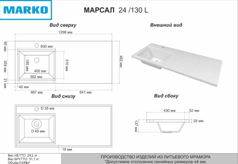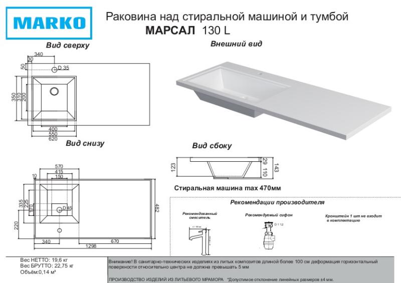 Умывальник Marko Марсал 130 на стиральную машину 5219130-2 из литьевого мрамора.Свойства материала. Натуральный молотый мрамор и полиэфирная смола. Гелькоутное покрытие ViaPal, плотная структура которого исключает образование грибка и плесени. Прочность значительно выше природного камня или бетона. Поверхность устойчива к химическим и умеренным механическим воздействиям. Белоснежный цвет, который не желтеет со временем. Точная геометрия. Установка. Раковина Марсал 130 см 5219130-2 для монтажа только на кронштейны над стиральной машиной. Установка непосредственно на поверхность бытового прибора не допустима. Удобное решение для небольших санузлов. Высота чаши-14.5 см. Разворот определяется по расположению чаши: чаша слева, полка справа. Производство. Российская компания "Марко" выпускает сантехнику из искусственного камня и мебель для ванных комнат. Собственный конструкторский отдел. Инновационные решения. Ручная доводка и полировка каждой единицы продукции. Качество. Дорогостоящие материалы. Жесткий контроль производства и готовых изделий. Экологически безопасная продукция соответствует всем строгим требованиям и нормам. Гарантия. Продолжительная гарантия от производителя - 5 лет. Внимание! Фактические размеры из-за особенностей производства материала могут отличаться от представленных в параметрах и на схемах. Изображение и цвет на мониторе могут отличаться от оригинала. Комплектность: