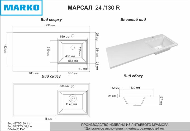 Умывальник Marko Марсал 130 на стиральную машину 5218130-2 из литьевого мрамора.Свойства материала. Натуральный молотый мрамор и полиэфирная смола. Гелькоутное покрытие ViaPal, плотная структура которого исключает образование грибка и плесени. Прочность значительно выше природного камня или бетона. Поверхность устойчива к химическим и умеренным механическим воздействиям. Белоснежный цвет, который не желтеет со временем. Точная геометрия. Установка. Раковина Марсал 130 см 5218130-2 для монтажа только на кронштейны над стиральной машиной. Установка непосредственно на поверхность бытового прибора не допустима. Удобное решение для небольших санузлов. Высота чаши-14.5 см. Разворот определяется по расположению чаши: чаша слева, полка справа. Производство. Российская компания "Марко" выпускает сантехнику из искусственного камня и мебель для ванных комнат. Собственный конструкторский отдел. Инновационные решения. Ручная доводка и полировка каждой единицы продукции. Качество. Дорогостоящие материалы. Жесткий контроль производства и готовых изделий. Экологически безопасная продукция соответствует всем строгим требованиям и нормам. Гарантия. Продолжительная гарантия от производителя - 5 лет. Внимание! Фактические размеры из-за особенностей производства материала могут отличаться от представленных в параметрах и на схемах. Изображение и цвет на мониторе могут отличаться от оригинала. Комплектность: