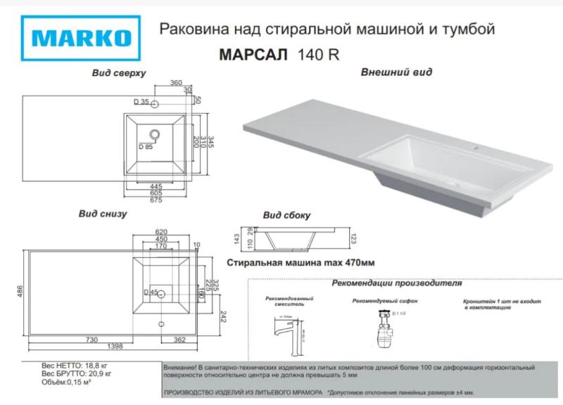 Умывальник Marko Марсал 140 на стиральную машину 5218141 из литьевого мрамора.Свойства материала. Натуральный молотый мрамор и полиэфирная смола. Гелькоутное покрытие ViaPal, плотная структура которого исключает образование грибка и плесени. Прочность значительно выше природного камня или бетона. Поверхность устойчива к химическим и умеренным механическим воздействиям. Белоснежный цвет, который не желтеет со временем. Точная геометрия. Установка. Раковина Марсал 140 см 5218141 для монтажа только на кронштейны над стиральной машиной. Установка непосредственно на поверхность бытового прибора не допустима. Удобное решение для небольших санузлов. Высота чаши-14.3 см. Разворот определяется по расположению чаши: чаша слева, полка справа. Производство. Российская компания "Марко" выпускает сантехнику из искусственного камня и мебель для ванных комнат. Собственный конструкторский отдел. Инновационные решения. Ручная доводка и полировка каждой единицы продукции. Качество. Дорогостоящие материалы. Жесткий контроль производства и готовых изделий. Экологически безопасная продукция соответствует всем строгим требованиям и нормам. Гарантия. Продолжительная гарантия от производителя - 5 лет. Внимание! Фактические размеры из-за особенностей производства материала могут отличаться от представленных в параметрах и на схемах. Изображение и цвет на мониторе могут отличаться от оригинала. Комплектность: