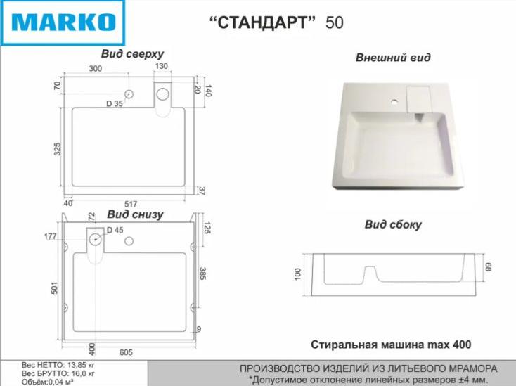 Раковина Marko Стандарт 50 на стиральную машину, 5227500. Все характеристики |