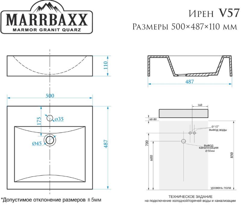 Раковина Marrbaxx Ирен V57D1 50x50 на стиральную машину, сигн. белый. Все характеристики |