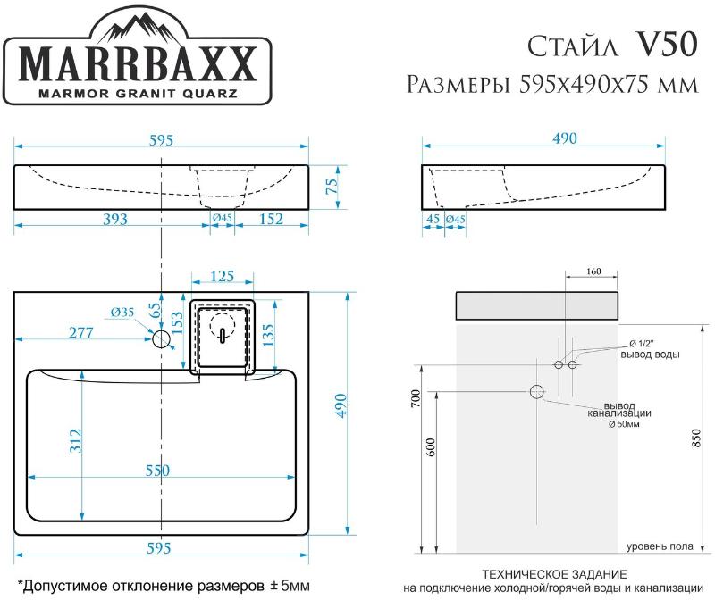 Раковина Marrbaxx Стайл V50D1 60x50 на стиральную машину, сигн. белый. Все характеристики |