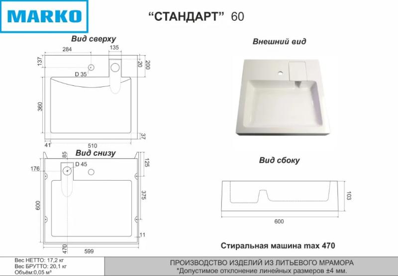 Раковина Marko Стандарт 60 на стиральную машину, 5227600. Все характеристики |