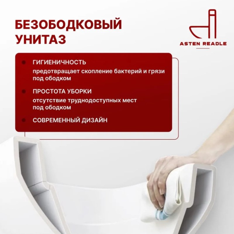 Подвесной унитаз Asten Readle Stella Tornado AR1065 из санитарного фарфора.Свойства материала. Гладкая поверхность без пор препятствует перемещению бактерий. Антибактериальное покрытие обеспечивает легкий уход, белизну и первоначальный внешний вид на долгие годы. Безободковый. Чаша без внутреннего ободка Rimless c технологией смыва Tornado по всему периметру без разбрызгивания воды. Унитаз удаляет отходы с первого раза сильным круговым потоком, при этом экономно расходует воду. Монтаж. Унитаз Stella Tornado AR1065 с подвесным монтажом имеет стандартное крепление и подходит для установки на любую инсталляцию. Сиденье. Тонкое легкосъемное сиденье Quick Fix с крышкой Soft Close из жесткого материала Duroplast повышенной прочности. Плавное, медленное, мягкое опускание микролифт не позволит крышке ударяться о борт унитаза. Цвет крышки с сиденьем идеально подходит в тон унитаза, сохранит свой первоначальный блеск на долго. Хромированные металлические петли. Производство. Молодая компания Asten Readle основана в Германии. Благодаря высокому качеству, стильному дизайну и доступной стоимостью товаров, ее продукция завоевала доверие покупателей. Качество. Сантехника Asten Readle изготовлена из проверенных и экологичных материалов. Каждое изделие проходит обязательную проверку на соответствие международным стандартам. Функциональность, удобство в использовании, современный дизайн делают изделия Asten Readle привлекательным выбором на любой вкус. Гарантия. Длительная гарантия - 20 лет. Изображение на мониторе может отличаться от оригинала. Комплектность:
