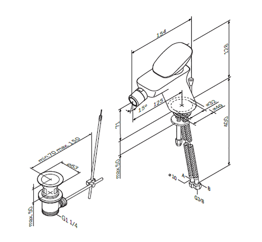 В комплекте: гибкая подводка, рычажный донный клапан 1 1/4“ с переливом, |