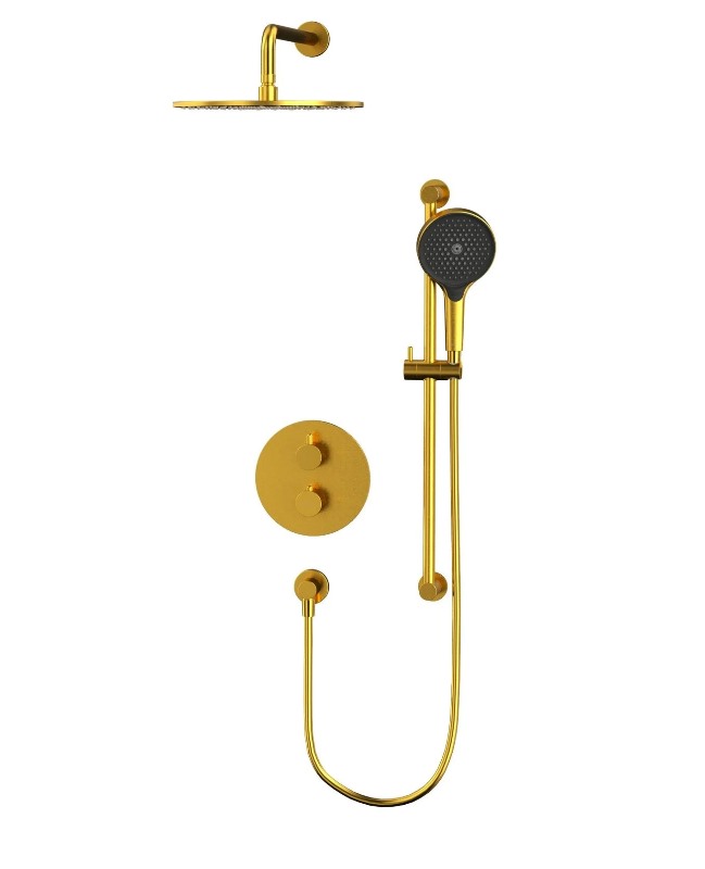 Скрытый монтаж. Диаметр розетки 20 см. Минимальная глубина для установки 7.5 см. PVD покрытие, цвет-золото. Гладкая и блестящая поверхность. Термостатический картридж с ограничителем на 38°C Vernet. Два входа (для горячей и холодной воды) - 3/4”. Два выхода смешанной воды - 1/2”. Запорно-переключающий вентиль. Пропускная способность при давлении 3 Бар: поток №1 - 20/3 л/мин, поток №2 - 20,3 л/мин. Встраиваемый смеситель-термостат для ванны и душа Y Y1236GL на стену.