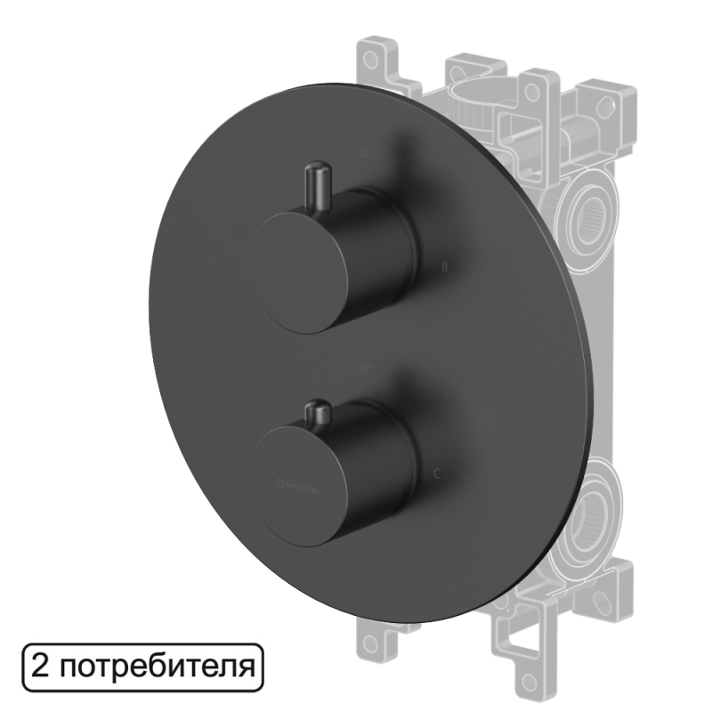 Скрытый монтаж. Диаметр розетки 20 см. Минимальная глубина для установки 7.5 см. PVD покрытие, цвет-оружейная сталь. Гладкая и матовая поверхность. Термостатический картридж с ограничителем на 38°C Vernet. Два входа (для горячей и холодной воды) - 3/4”. Два выхода смешанной воды - 1/2”. Запорно-переключающий вентиль. Пропускная способность при давлении 3 Бар: поток №1 - 20/3 л/мин, поток №2 - 20,3 л/мин. Встраиваемый смеситель-термостат для ванны и душа Y Y1236GM на стену.