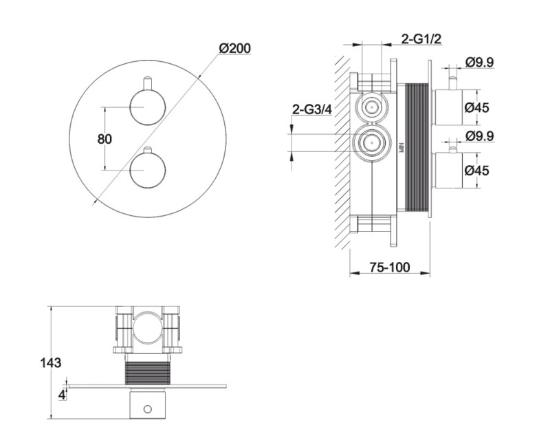 Скрытый монтаж. Диаметр розетки 20 см. Минимальная глубина для установки 7.5 см. PVD покрытие, цвет-брашированный никель. Гладкая и матовая поверхность. Термостатический картридж с ограничителем на 38°C Vernet. Два входа (для горячей и холодной воды) - 3/4”. Два выхода смешанной воды - 1/2”. Запорно-переключающий вентиль. Пропускная способность при давлении 3 Бар: поток №1 - 20/3 л/мин, поток №2 - 20,3 л/мин. Встраиваемый смеситель-термостат для ванны и душа Y Y1236NIB на стену.