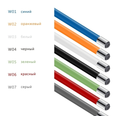 В комплекте: гибкая подводка.Цветной излив на выбор: синий-W01, оранжевый-W02, белый-W03, черный-W04, зеленый-W05, красный-W06, серый-W07. |