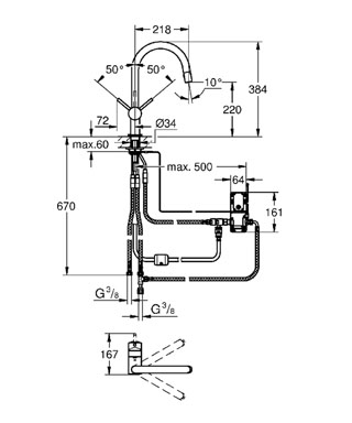 электропитание от литиевой батарейки 6 V, тип CR-P2. SilkMove керамический картридж 46 мм. Встроенная выдвижная лейка duo с возвратной пружиной, встроенный обратный клапан. Автоматический переключатель аэратор/SpeedClean душевая струя, возвратное переключение на аэратор после выключения. Система быстрого монтажа с защитой от обратного потока. Комплектность: