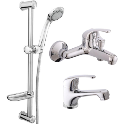 В комплекте: смеситель для ванны Optima-10, смеситель для умывальника Optima-18, душевая штанга Varianta (диаметр 2.5 см) 621010, ручной душ Delta 3 режима (диаметр 7 см) 622045, шланг для душа S.S. Con/Imp 150 см, мыльница, соединительные шланги высокого давления 40 см. |