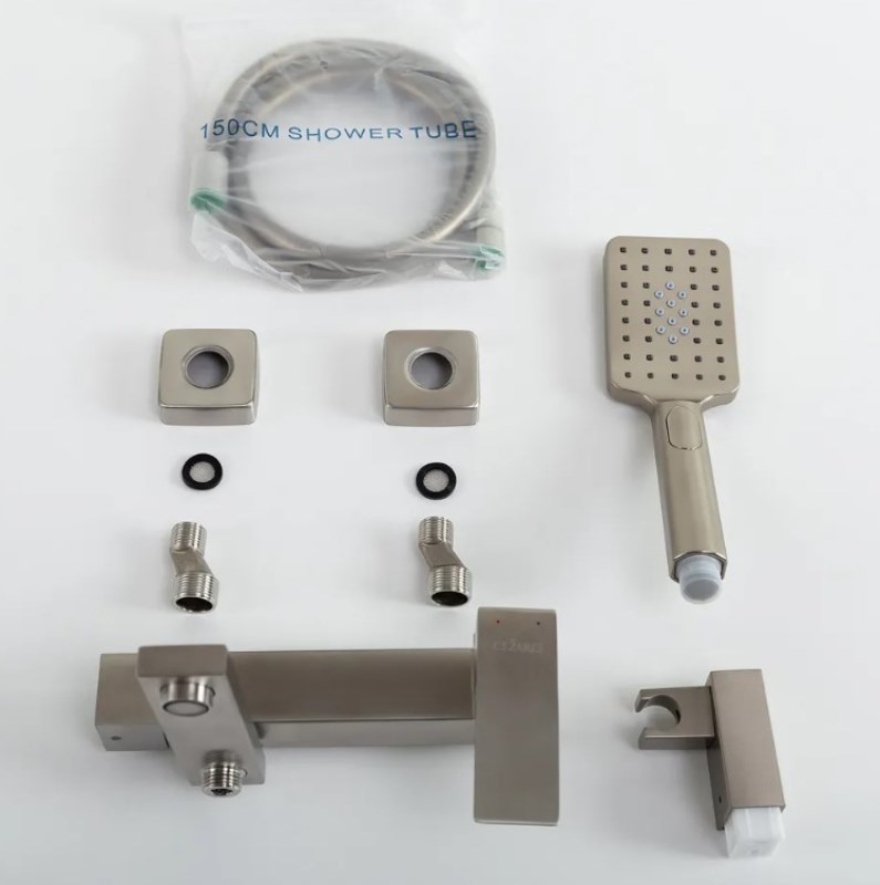 В комплекте: эксцентрики, аэратор, переключатель потоков, душевой шланг, ручной душ 3-х режимный, держатель настенный. |